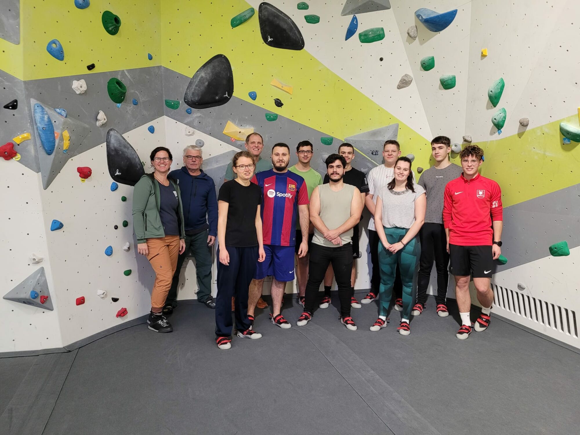 Das Team der Kletterhalle (links) mit den Auszubildenen (Mitte) und deren Ausbildungsleiter (rechts)